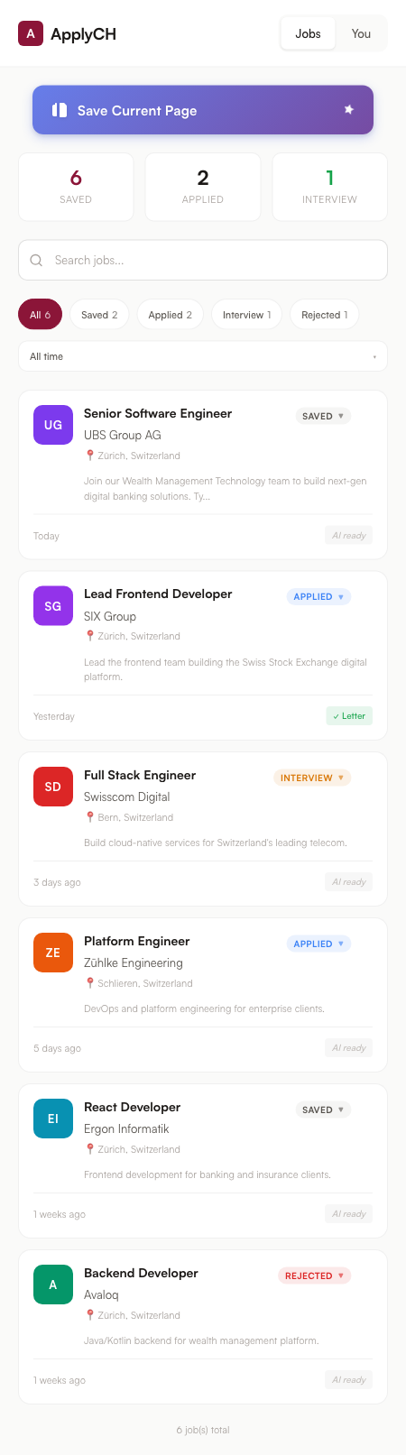 Any website. Our universal scraper extracts job details from LinkedIn, jobs.ch, Indeed, company career pages, and any site with a job posting. If you can see the job, ApplyCH can save it.